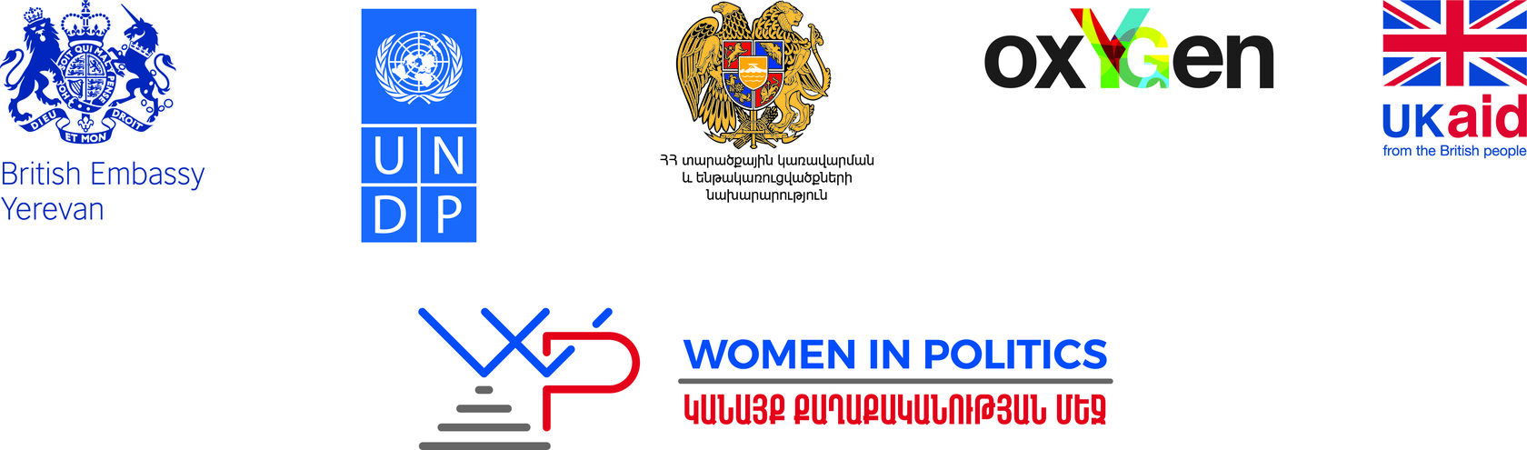 Հետազոտությունը պատրասվել է «Կանայք քաղաքականության մեջ» ծրագրի շրջանակներում: Ծրագիրն իրականացվում է ՄԱԿ-ի Զարգացման ծրագրի կողմից՝ ՀՀ տարածքային կառավարման և ենթակառուցվածքների նախարարության և ՕքսԵՋեն հիմնադրամի հետ համագործակցությամբ, Միացյալ Թագավորության «Լավ կառավարման հիմնադրամի» աջակցությամբ: